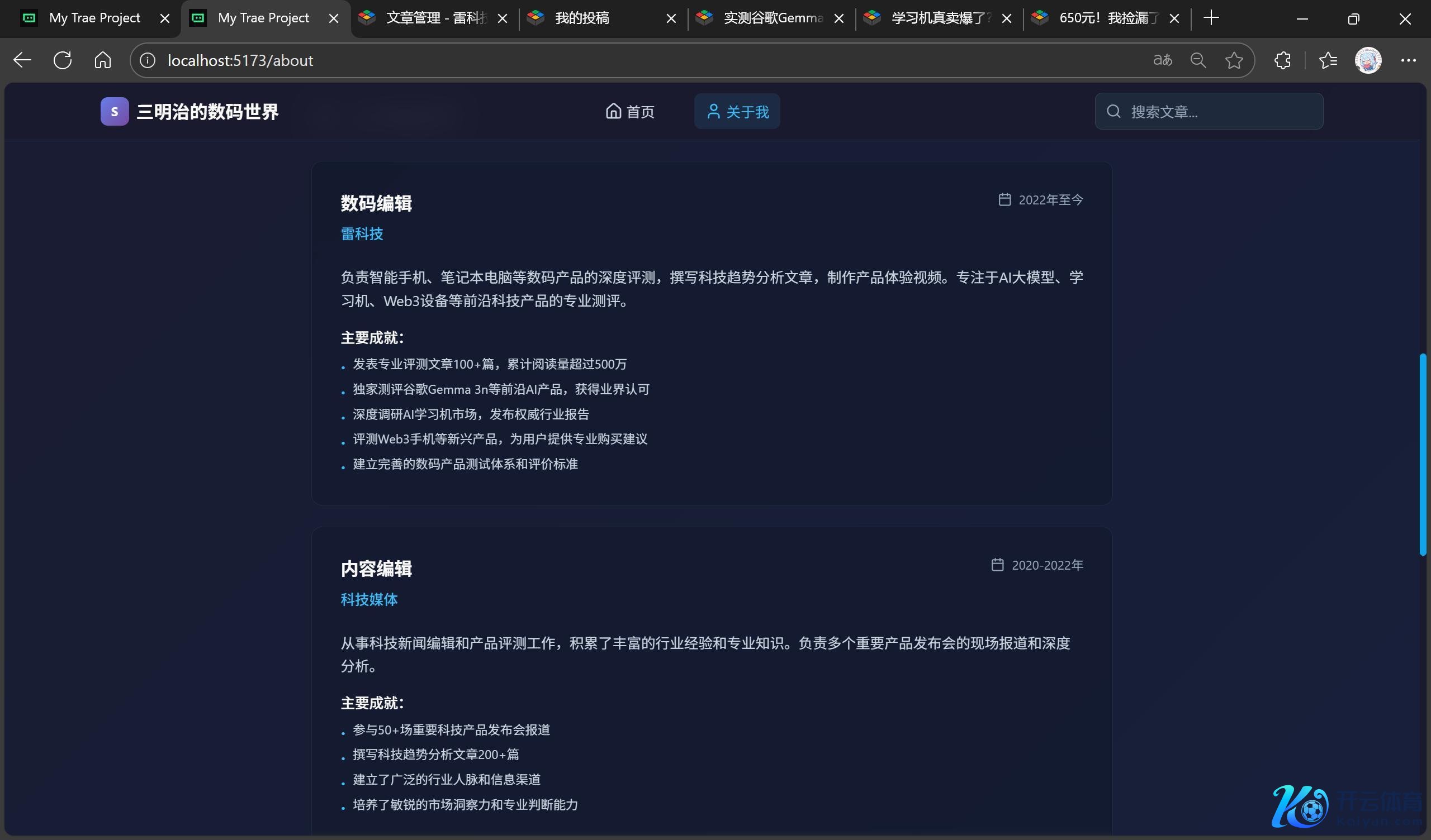 大致十分钟后,系统辅导“神气拓荒完成”。又过了几分钟,内嵌的浏览器窗口自动刷新,一个简单但五脏俱全的网站原型就出目前我目下。首页上整皆陈设着几篇用占位符填充的著作卡片,点击后照实能跳转到确定页,“对于我”的连系也真实有用。