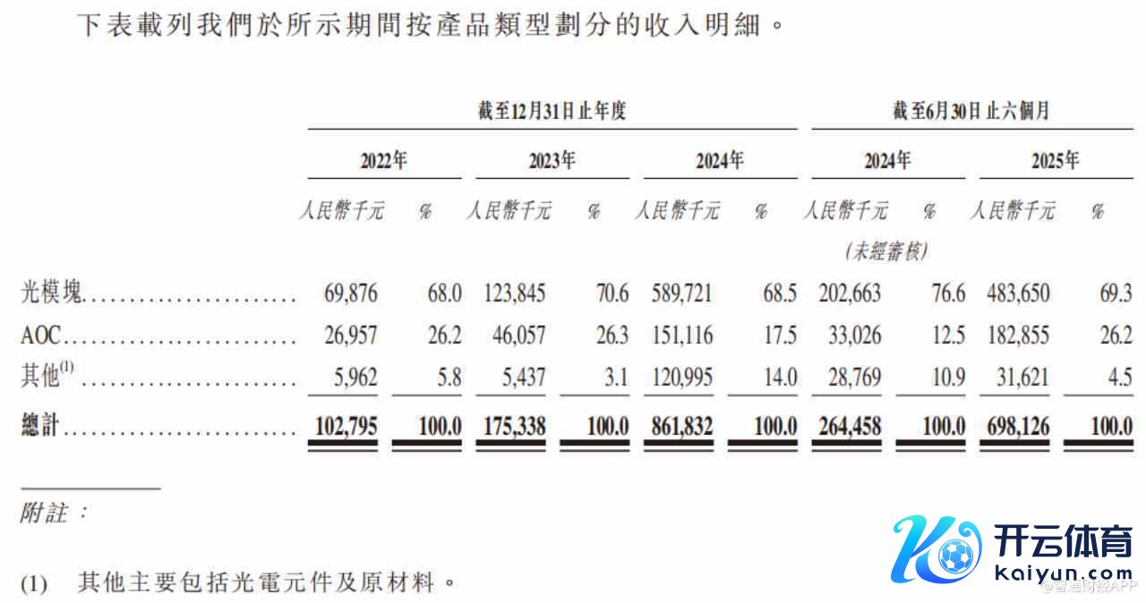 居品收入结构上,光模块为公司中枢收入着手,2022-2024年及2025年上半年收入占比分散为68%、70.6%、68.5%及69.3%;AOC居品占比在12.5%-26.3%之间波动,2025年上半年达26.2%;其他居品(主要包括光电元件及原材料)占比相对较小,2025年上半年为4.5%。