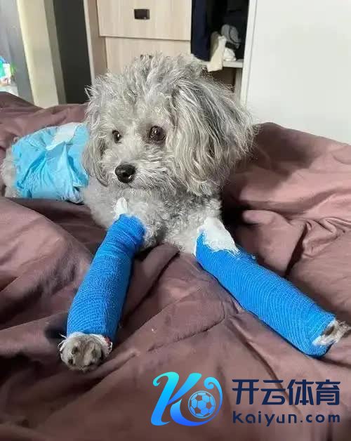 另一只白色的比熊,因腿骨骨折裹上了厚厚的绷带,趴着的时代远眺仿佛一幅“2D平面图”,让东谈主一时辰不清正反面;