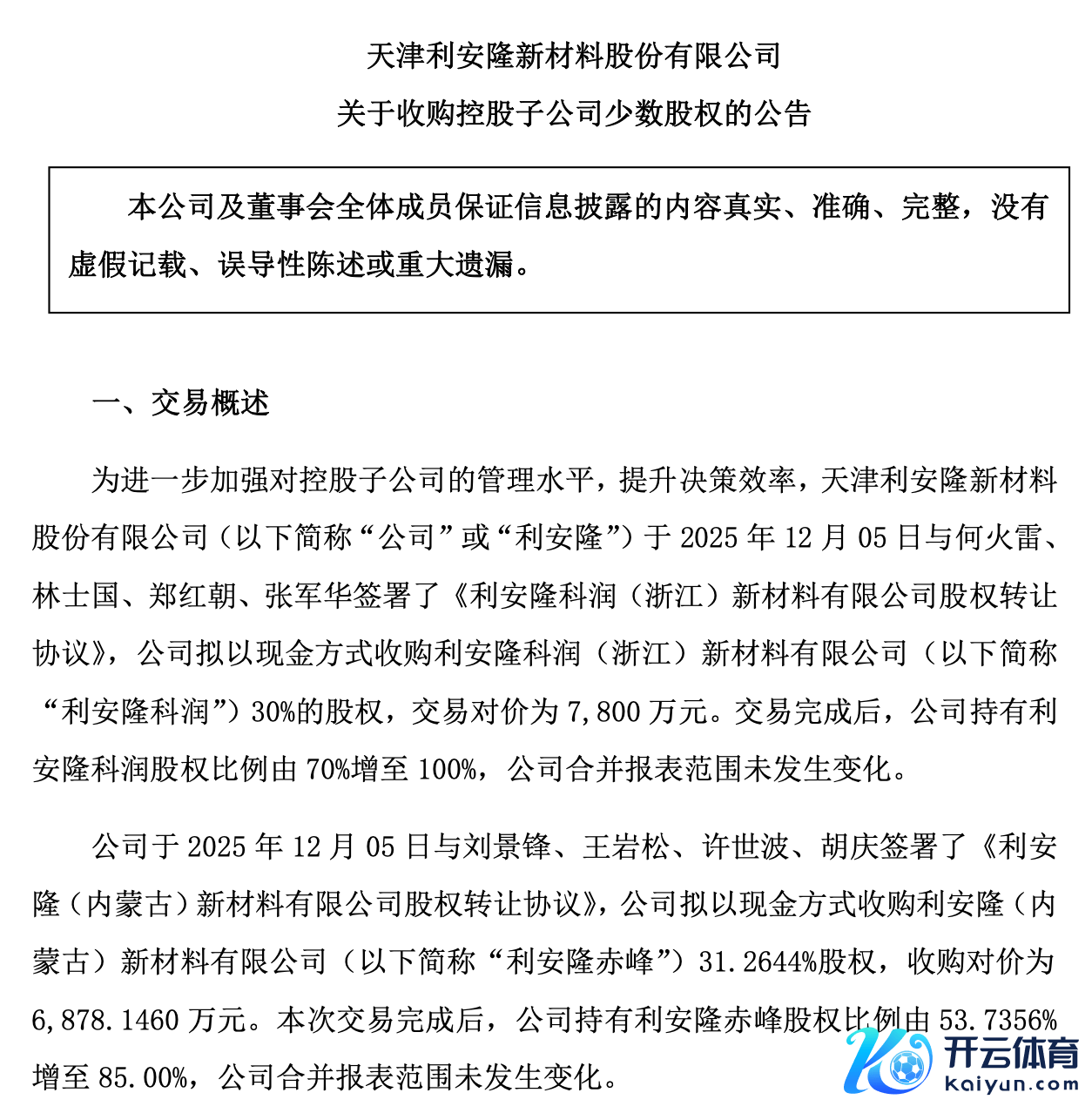具体来看,公司于12月5日与何火雷、林士国、郑红朝、张军华签署了《利安隆科润(浙江)新材料有限公司股权转让条约》,公司拟以现款景观收购利安隆科润30%的股权,走动对价为7800万元。走动完成后,公司持成心安隆科润股权比例由70%增至100%,公司吞并报表范围未发生变化。