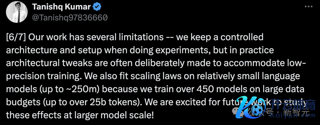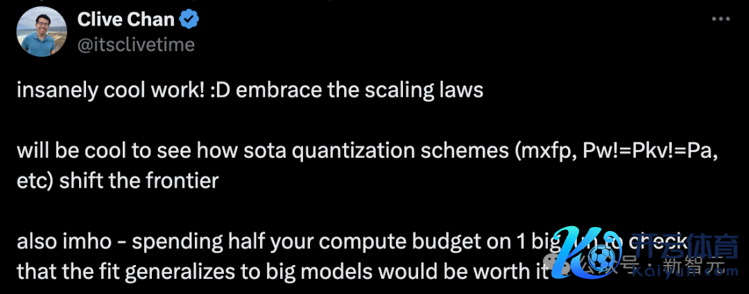 OpenAI接头员Clive Chan示意,拥抱scaling law,望望起先进的量化有贪图(mxfp,Pw≠Pkv≠Pa等)怎样推动前沿将会很酷好。另外,我个东说念主以为,值得破耗一半的计较预算来进行一次大规模运行,以考证这个拟合是否适用于大模子。