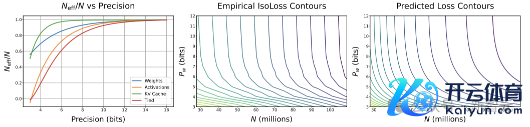接头东说念主员在保执激活值(Pa)和KV缓存(Pkv)的精度固定在较高水平的情况下,查验了权重精度(Pw)与参数目(N)之间的量度,其中设定D = 13B个token,并在N和Pw的不同组合上进行了网格扫描。
