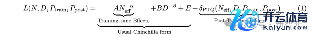 对于N个参数的言语模子,在D个token上进行锤真金不怕火,锤真金不怕火精度为P_train ,锤真金不怕火后权重精度为 P_post ,最终接头东说念主员找到了一个融合的scaling law: