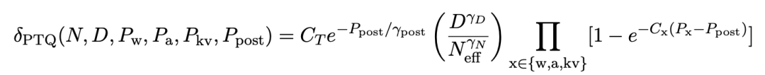 其中,A、B、E、α、β是正拟合常数,δ_PTQ是指推理前锤真金不怕火后量化引起的耗费退化