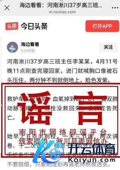 近日,某平台账号“海边望望”造谣发布过错信息称“河南淅川37岁高三班主任晚自习下学后身一火”。经向南阳市淅川县纯熟部门核实云开体育,淅川县8所高中未发现合适上述践诺的东谈主员及事件,网传践诺系坏话。