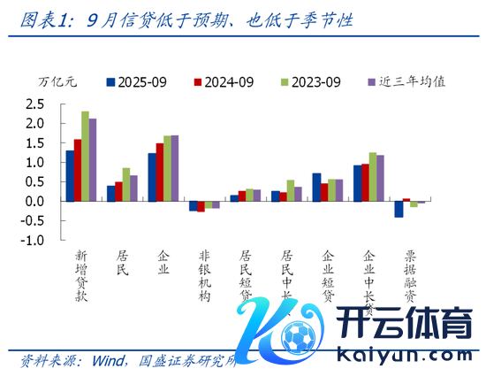 >总量看,9月新增信贷1.29万亿,同比少增3000亿,彰着低于季节性(近三年同期均值为2.12万亿),也低于预期(市集预期1.39万亿)。其中,住户贷款增多3890亿,同比少增1110亿;企业贷款增多1.22万亿,同比少增2700亿;非银贷款减少2348亿,同比少减356亿。