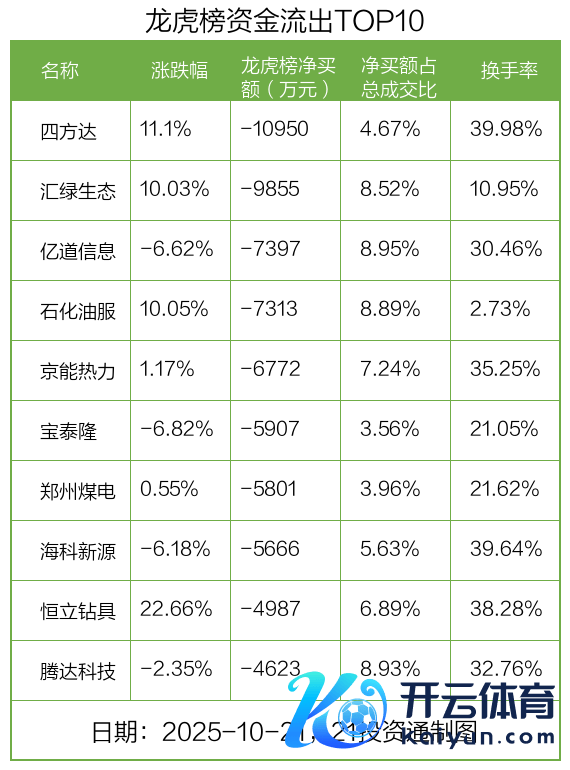 而龙虎榜中资金净流出最多的是四方达(300179.SZ),被净卖出为1.09亿元,占总成交金额的4.67%。四方达收盘上升11.1%,换手率为39.98%。