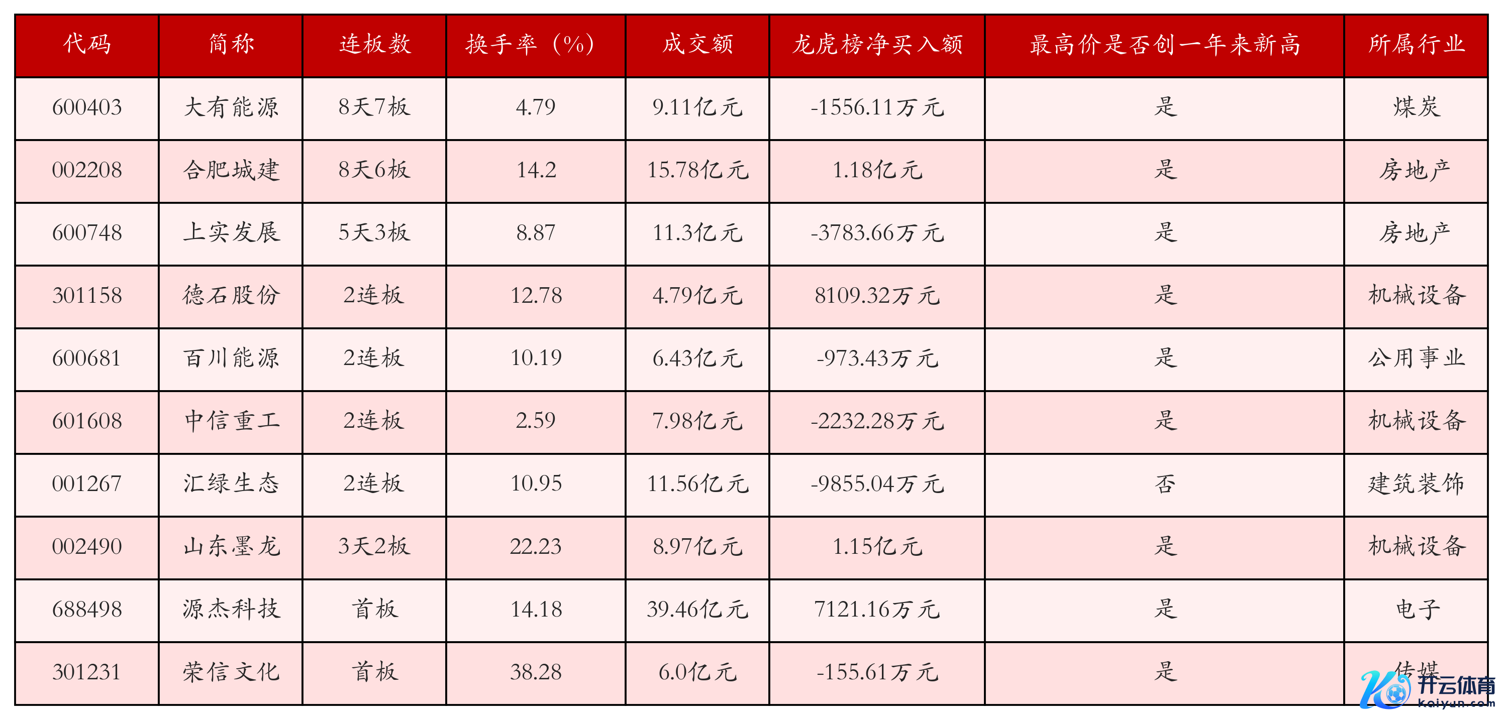一、强势个股铁心10月21日收盘,上证综指飞腾1.36%,收于3916.33点,深证成指飞腾2.06%,收于13077.32点,创业板指飞腾3.02%,收于3083.72点。本日沪深两市A股瞎想90只涨停,空洞面前连板数以及当日龙虎榜数据,其中较为强势的前三只个股分歧为:大有动力(600403)、合肥城建(002208)与上实发展(600748)。本日强势个股前10位具体数据见下表: